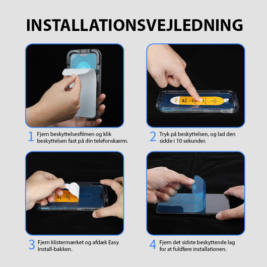 Installationen er hurtig og nem, og med den medfølgende guide har det aldrig været lettere at montere skærmbeskyttelse korrekt. Følg blot vejledningen på det 4. billede for et perfekt resultat.