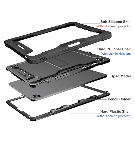 Coveret er designet i 3 dele - det yderste lag er blodt silikone materiale der er stødarbsoberende, hvilket vil sige at stødet fra et tab eller slag, føres ud i coveret istedet for din iPad, så du undgår trykskader på skærm og indmad. Det næste lag er fremstillet af hærdet plastik, som giver dig fuld beskyttelse fra ridser og skrammer. Det sidste lag er til for at beskytte skærmen, da laget hæver skærmen, så din iPad ikke hviler på skærmen, samt giver den ekstra beskyttelse på hjørnerne, som er et af de svageste punkter på en iPad.