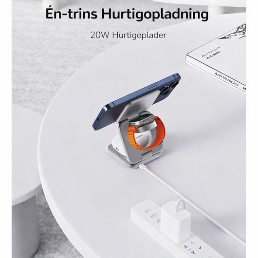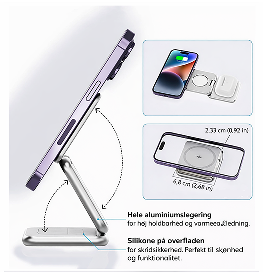 Opladerstationen understøtter Qi-teknologi, hvilket gør den kompatibel med en lang række enheder, inklusive smartphones, trådløse hovedtelefoner og smartwatches. Den 3-i-1 funktionalitet giver dig mulighed for at oplade flere enheder samtidigt, hvilket sparer dig tid og plads.