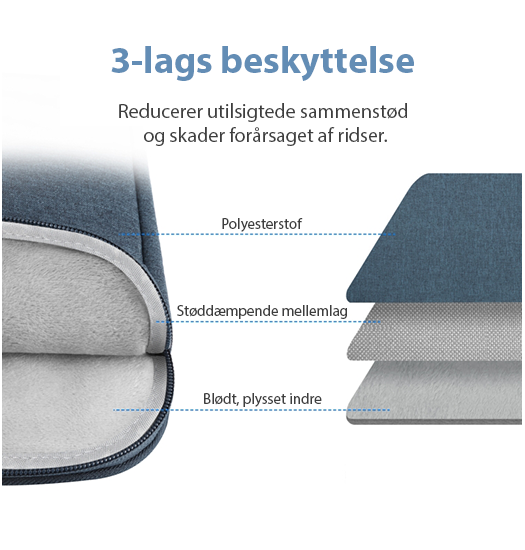 Produktet er lavet i et 3 delt beskyttelse design, så du har polyester på ydre siden, som også kan bruges til musemåtte. Den er udstyret med et stødsikkert midterlager, som beskytter din enhed bedre fra stød - hvis du skulle være så uheldig at tabe enheden. Indersiden er blødt og tykt, så du slipper fra ridser på enheden.